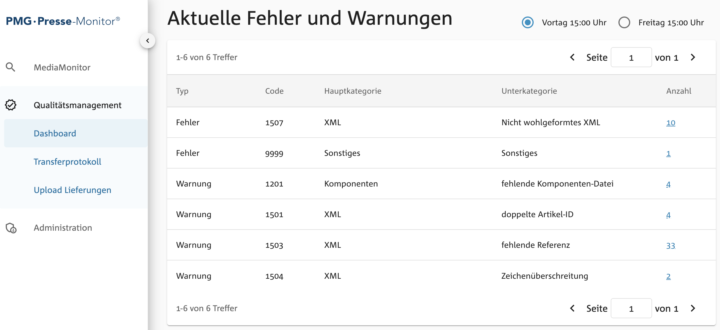 | Fehler | 1001 | Ausgabedatum | Ausgabe bereits vorhanden | Eine Lieferung mit selben Ausgabedatum liegt bereits vor. |