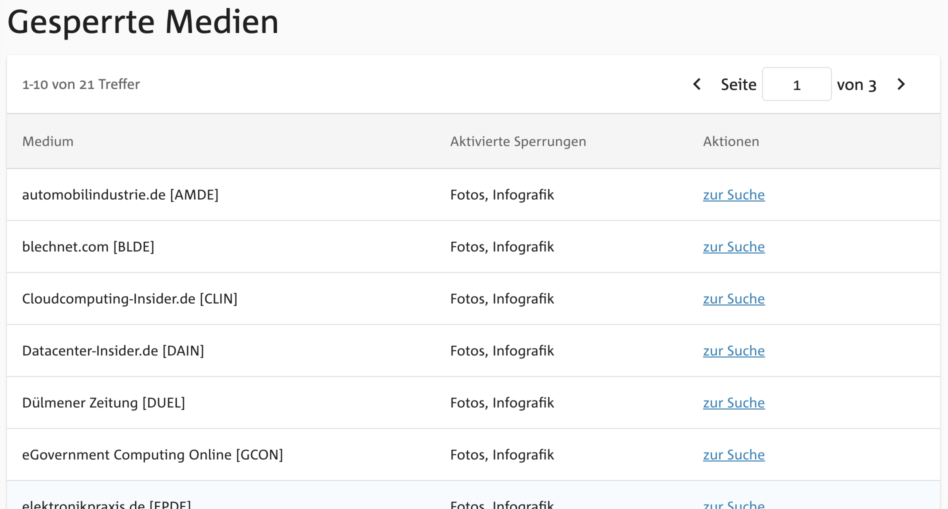 Aufgrund von Qualitätsmängeln oder Lieferproblemen können Daten oder Teile der Lieferungen, z. B. Bilder, für die Bereitstellung im PMG Kundenportal gesperrt werden. Eine Übersicht der betroffenen Medien und die für sie aktiven Sperrungen finden Sie in diesem Bereich:
