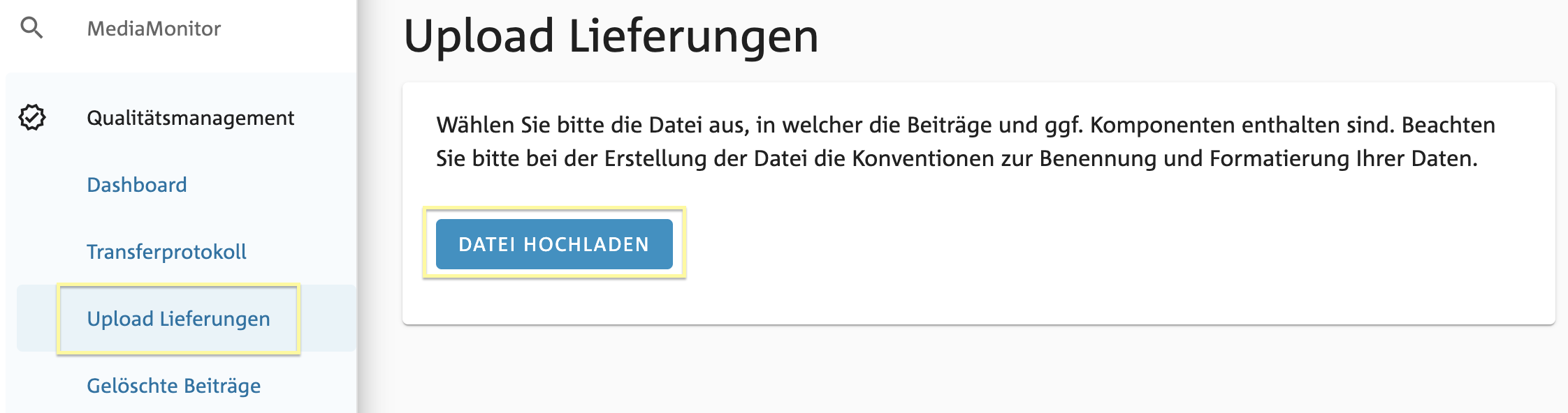 Für den manuellen Upload Ihrer Datei(en) nutzen Sie bitte das Menü »Qualitätsmanagement > Upload Lieferungen« in unserer Pressedatenbank. Die Anforderungen an das Datenpaket gelten hierfür ebenso wie für Lieferungen per FTP/SFTP.