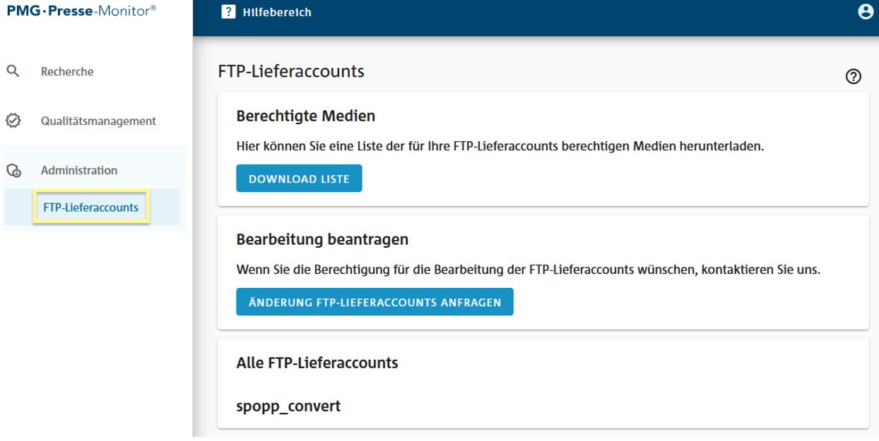 Bei Änderungen an Ihrem Nutzerkonto (z. B. E-Mail-Adresse) oder zur Einrichtung weiterer Nutzerkonten wenden Sie sich bitte an unseren Lieferantensupport. Zur Übersicht Ihrer FTP-Lieferaccounts oder einer Liste der berechtigten Medien / lieferbaren Medien, gehen Sie in das Untermenü »Administration > FTP-Lieferaccounts«.