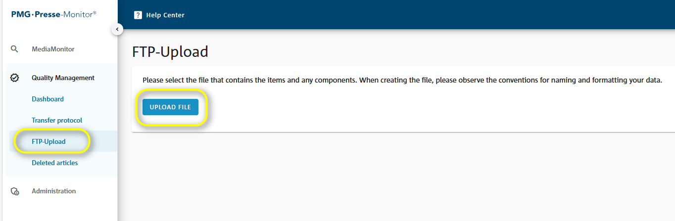 To upload your file(s) manually, please use the menu item “Quality management > FTP-Upload” in our press database. The requirements for supplying data apply here, as well as for deliveries via an FTP/SFTP server.