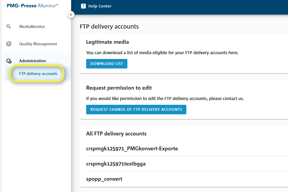 If you wish to make changes to your user account (e.g. email address) or set up additional user accounts, please contact our supplier support team. For an overview of your FTP delivery accounts or a list of authorised/deliverable sources, go to the sub-menu “Administration > FTP delivery accounts”.